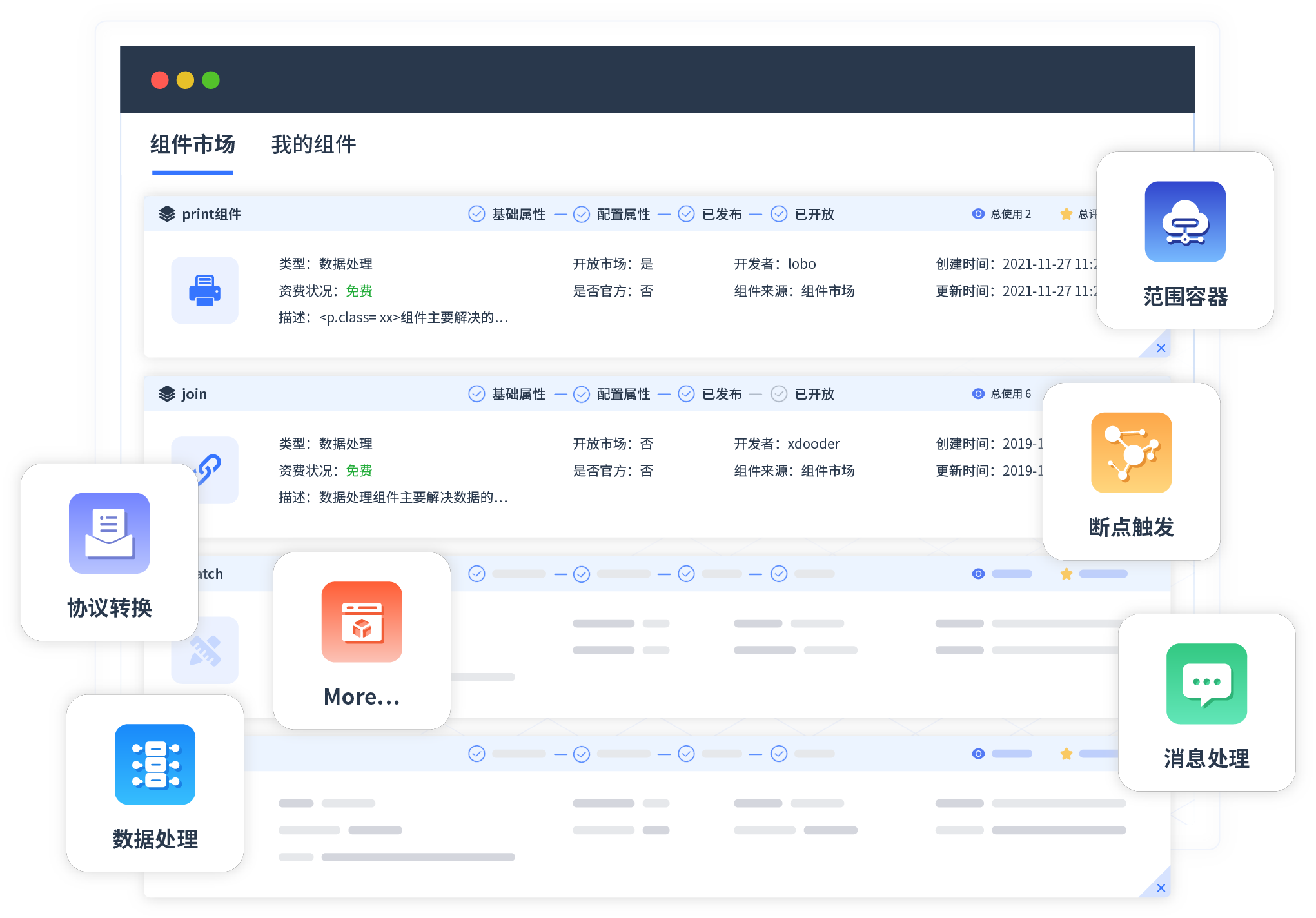 针对集成场景,long8国际唯一官网提供组件市场,例如协议转换、消息处理、文件操作等。除平台提供的组件外,客户可以自定义所需组件。